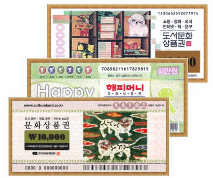 종류로는 컬쳐랜드, 해피머니, 북앤라이프가 있습니다. 컬쳐랜드는 다양한 서비스에서 사용 가능하고, 해피머니는 사용 범위가 넓으며 해피캐시로 전환할 수 있습니다. 북앤라이프는 도서 구매에 특화되어 독서와 학습을 장려합니다. 온라인 구매처로는 현대홈쇼핑, SSG.com, CJ 온스타일, AK몰, G마켓, 옥션이 있으며, 오프라인 구매처는 전국 서점/문구, 편의점, 우체국, 경남은행, 저축은행이 있습니다.