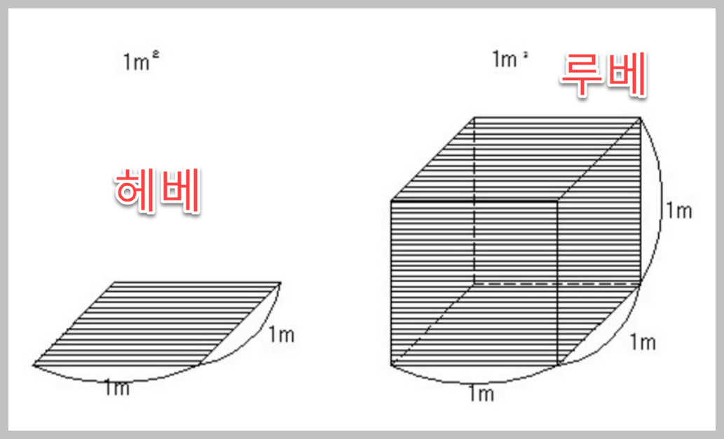 위에서도 이야기 했지만이 말들은 일본어에서 유래되었습니다. 평방미터는 일본어로 '헤이베이'라고 하며, 이 말이 '헤베'로 변했습니다. 입방미터는 '류우베이'라고 읽으며, 한국에서는 처음에 '류베'라고 불렀다가 '루베'로 변했습니다.